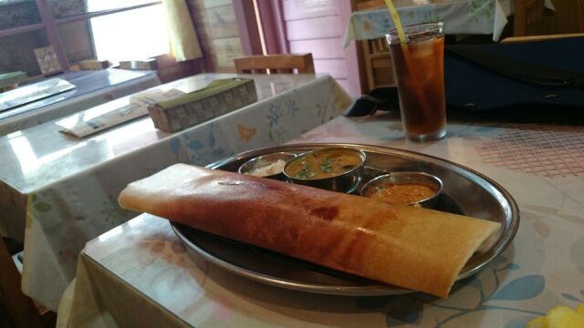 注文したのは、今や私の好物に成った感のあるマサラドウーサです。米粉入りのクレープにカレー味のポテトが入っています。