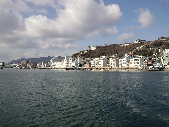 この尾道は尾道水道と対岸の向島を結ぶフェリーからの映像です。よく目にする尾道の一枚はこの正面の千光寺山の中腹から映したものです。この海からの風景はどこか南欧の田舎町を思い起こさせる処がありお気に入りです。