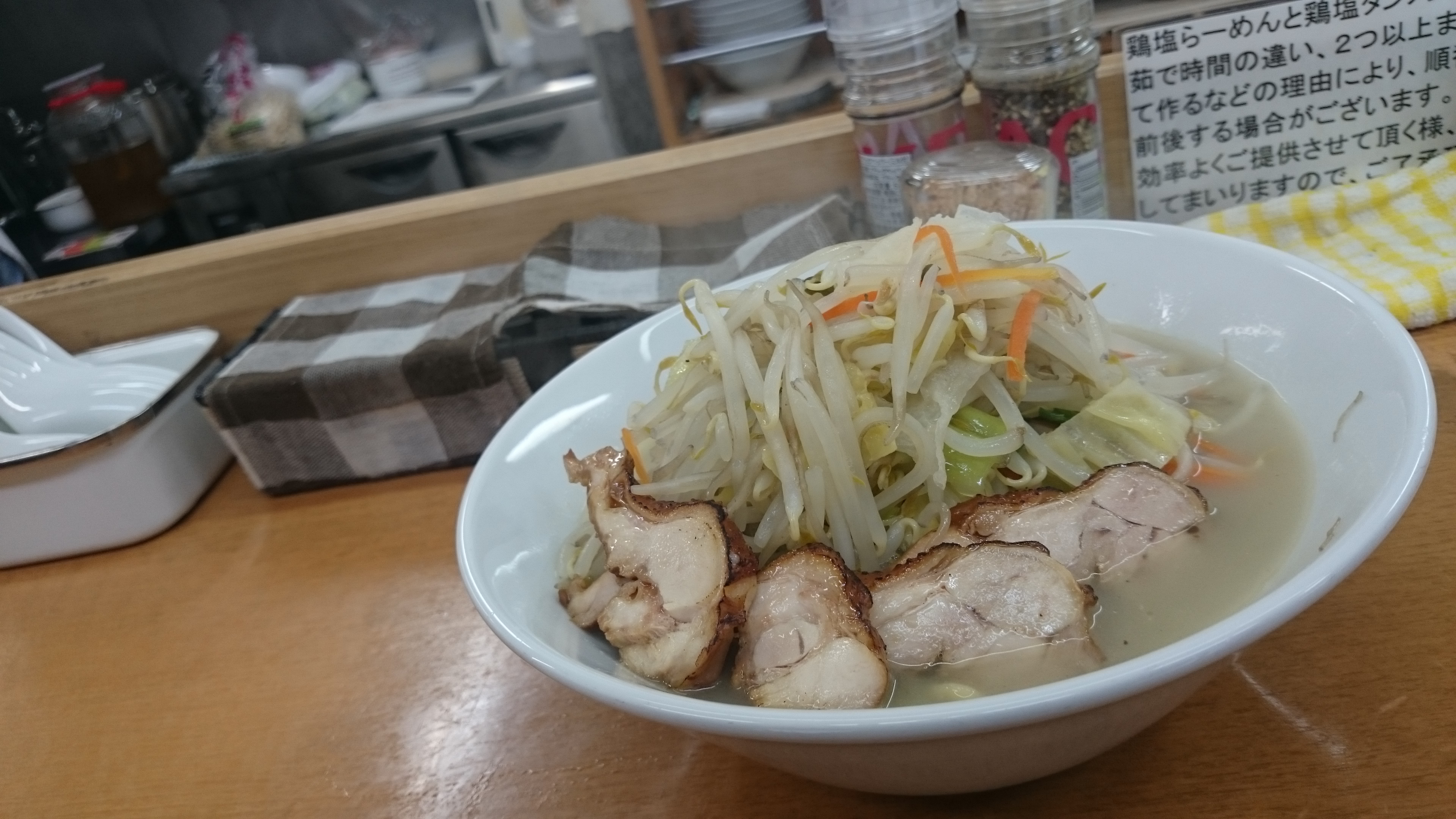いただいたのは鳥チャーシューの付いたタンメンです。麺が150グラムと少な目ですがたっぷりの野菜が補ってくれていました。