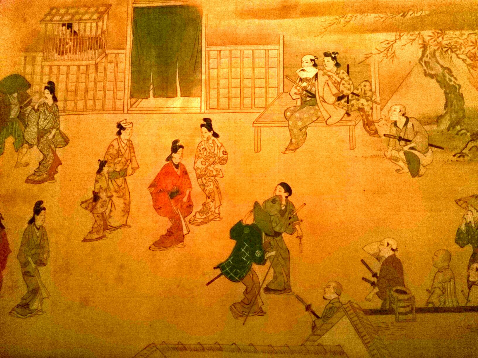 遊廓を訪れた従者を連れた高位の武士は顔隠しています。また前髪のある若侍を供なたった武士はあらぬ目論みなどあるのでしょうか。